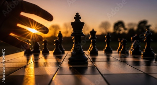 A hand reaching for a chess piece on a chessboard with a sunset in the background.
