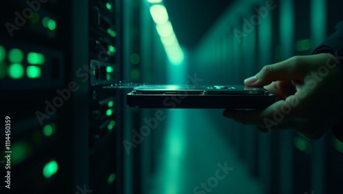 A hand silhouette pulls a hard drive from a glowing server rack in a futuristic data center with holographic data streaming.