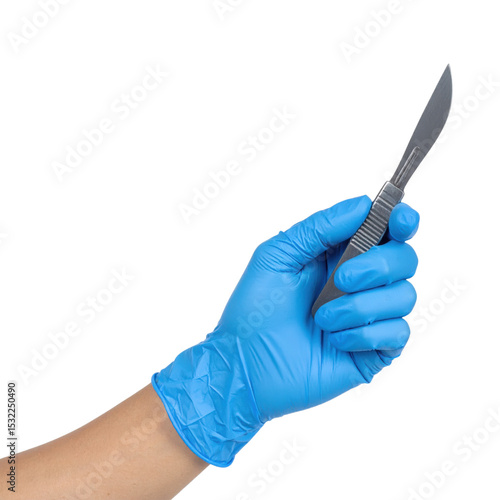 A hand wearing a blue medical glove holds a stainless steel surgical scalpel with a sharp blade.