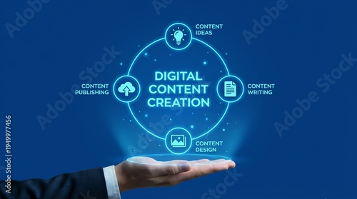 A hand with a business suit sleeve extended palm up holding a glowing digital content creation concept with related icons on a blue background