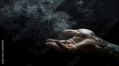 a hand with a tattoo on it and smoke on a black background