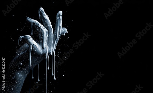 A hand with melting white substance against a black background