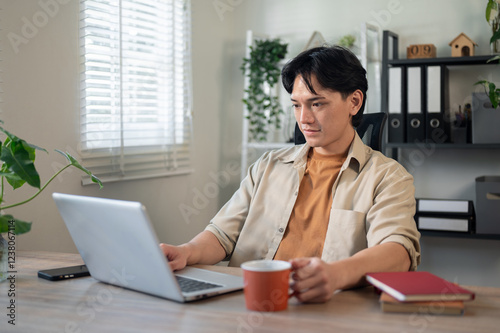 A handsome, smart Asian businessman is working on his laptop at a desk in his minimalist office.