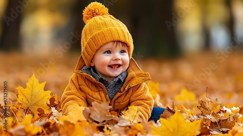 A happy baby wearing a yellow knit hat laughs while playing in a pile of autumn leaves.