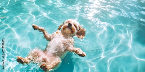 A happy dog enjoying a sunny day by floating in a clear blue pool.