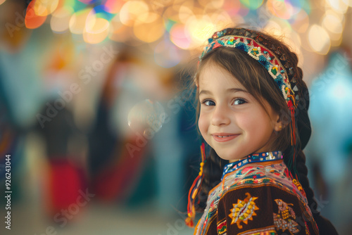 A happy little girl wearing traditional clothes. Cute child with a headdress in front of glowing party lights.