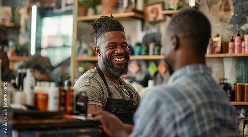 a happy male barber hair designer is having a conversation with a customer at a barber shop.