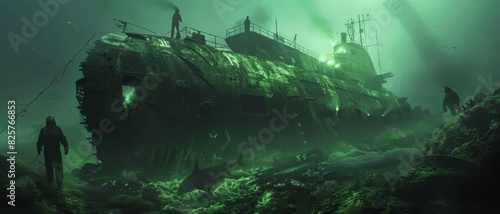 A haunted submarine wreck with an eerie green glow, explored by mysterious figures, creating a chilling underwater scene.