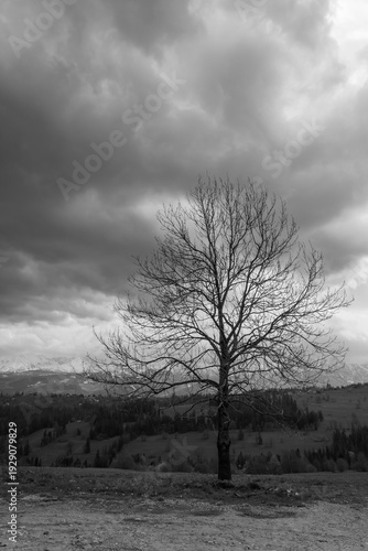 A haunting, dry tree with spreading branches, a gray, cloudy sky in the background, a depressing landscape