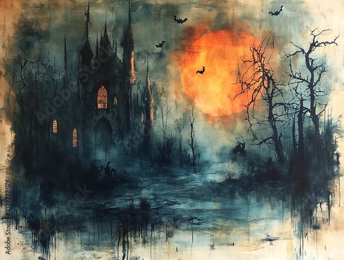 A haunting landscape featuring a dark castle, eerie trees, and a large orange moon.