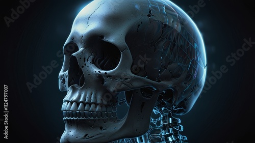 A hauntingly beautiful rendering of a human skull, with intricate details of the cranial bones and facial structure, illuminated by an ethereal X-ray light.