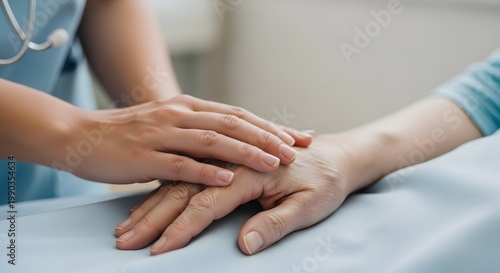 A healthcare professional gently holds the hand of a patient offering comfort and support during a vulnerable moment in a hospital setting