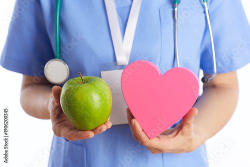 A healthcare professional in blue scrubs holds a green apple and a heart symbol, representing the link between nutrition, healthy eating, and cardiovascular wellness.
