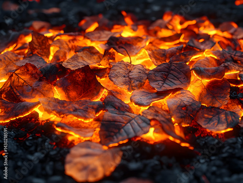 A heap of leaves glowing red Dark edges contrast bright veins A warm fiery tone