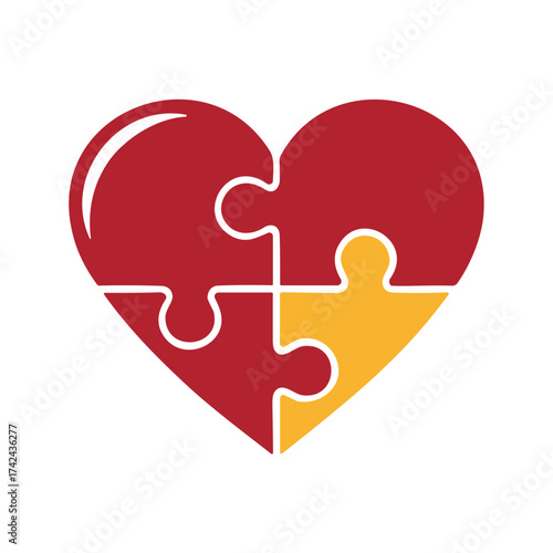 A heart is formed by red and yellow jigsaw puzzle pieces, symbolizing unity, love, and the coming together of different elements.
