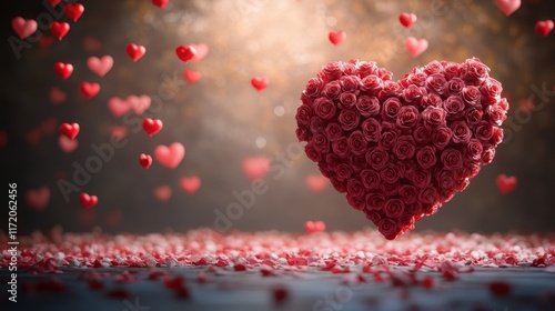 A heart-shaped arrangement of roses rests on a table, surrounded by delicate petals, creating a romantic atmosphere perfect for Valentine's Day.