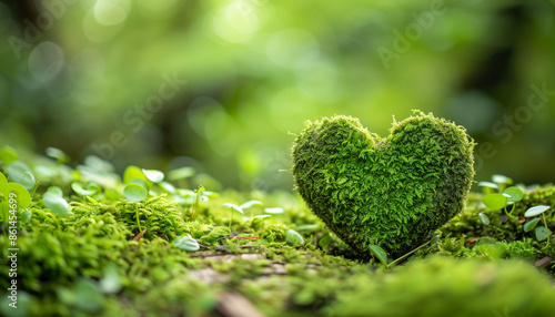 A heart-shaped moss sculpture on a forest floor, symbolizing love and the beauty of nature, surrounded by lush green plants and soft sunlight