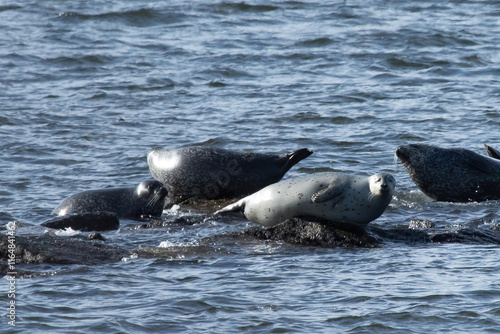 A herd of seals can be seen hauled out on the rocks in the bay off the coast of Sandy Hook, New Jersey. A combination of Harbor, Grey, and Harp seals can be seen during this annual migration.