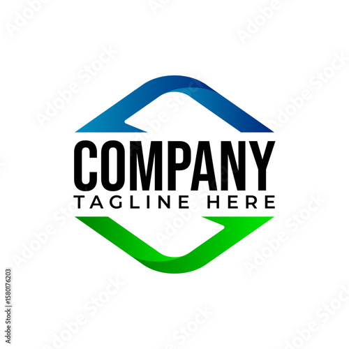 A hexagonal logo with a loop of gradient ribbon (blue on top, green on bottom) with arrows,