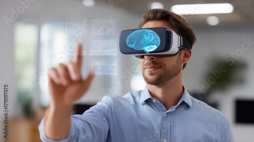 A high tech expert in VR glasses interacts with a digital AI brain predictive analytics visuals swirling on generic cloud dashboards a futuristic workspace AI neural networks