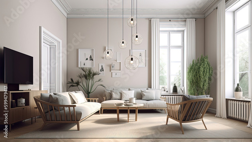 A high-ceilinged living room that features an inviting off-white color interior, streaming sunlight through the large windows. Photorealistic illustration, Generative AI