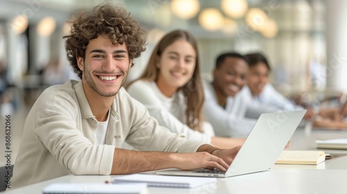 A high-definition close-up photo of a multicultural group of students collaborating on a digital project using laptops and tablets