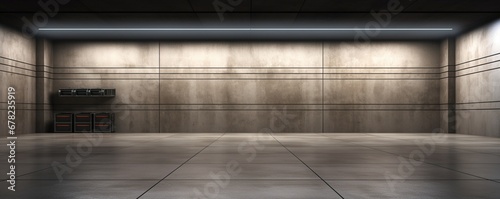A high-definition image of a modern concrete garage interior with a mock-up space and blurry walls, featuring clean and shiny surfaces with a symmetrical grid line texture.
