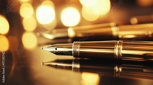 A high-end pen lying across a sophisticated desk, with its polished surface reflecting the office lighting.