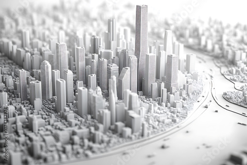 A highly detailed 3D model of a cityscape in pristine white, featuring buildings, streets, and infrastructure with intricate precision, creating a modern and minimalistic urban design without textures