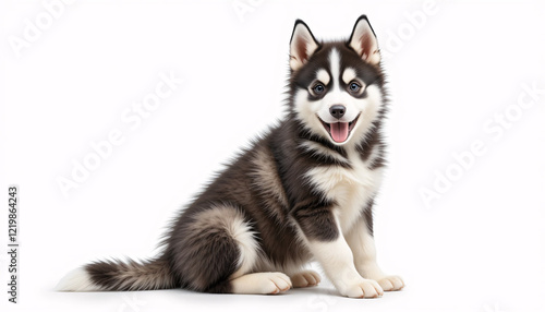 A highly detailed and realistic full-body image of a husky puppy sitting down with its fluffy fur, vibrant blue eyes, and expressive face, isolated, friendly, joyful, cute, detailed, lifelike, pet