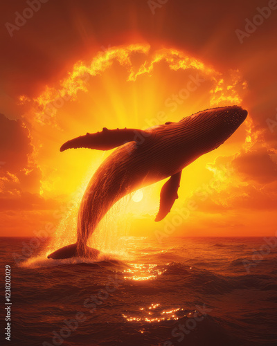 A high-resolution close-up of a whale’s spout and breached body against a backdrop of a brilliant, fiery sunset over the ocean, evoking nature’s power,