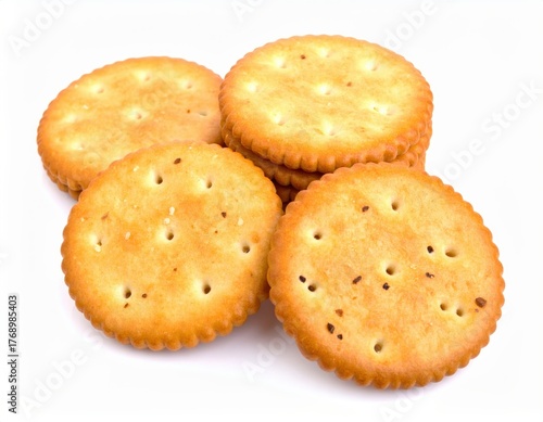 A high-resolution image of golden round crackers stacked together, showcasing texture and detail against a white background.