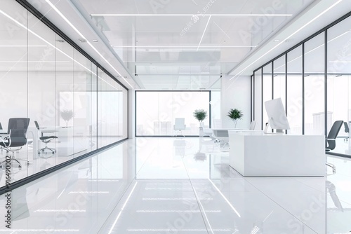 A high-resolution photo of a clean and modern office interior with large windows, soft lighting,