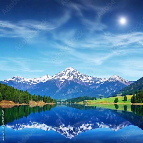 A high-resolution ultrarealistic image depicting a serene lake perfectly reflecting snow-capped mountains. The digital artwork showcases lush green rolling hills dotted with trees and a quaint cabin n
