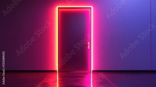 A high-tech futuristic sliding door shut, glowing with neon lights.