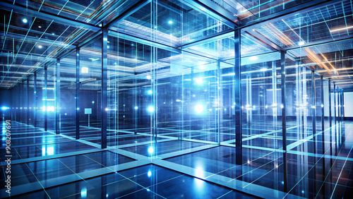 A high-tech space with translucent panels through which pulsating lines of light are visible, symbolizing the processor connections of artificial intelligence.