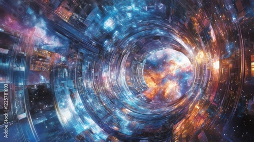 A high-tech starship bridge with a panoramic view of a galaxy through transparent walls