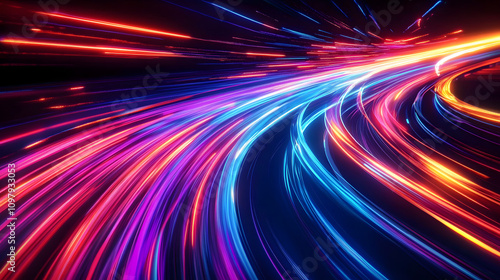 A highway with colorful light trails, symbolizing the speed and movement of digital marketing. Generative AI.