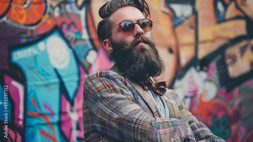 A hipster with a beard and undercut hairstyle, posing against an urban graffiti wall.