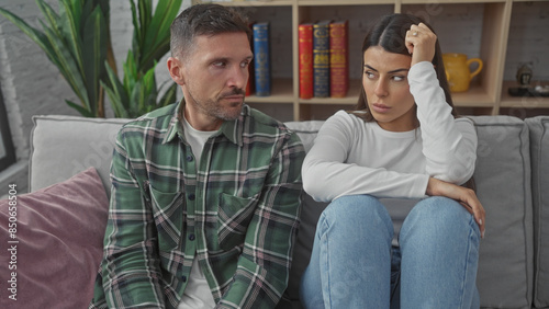 A hispanic couple appears troubled sitting together on a grey sofa indoors, showing tension and contemplation.