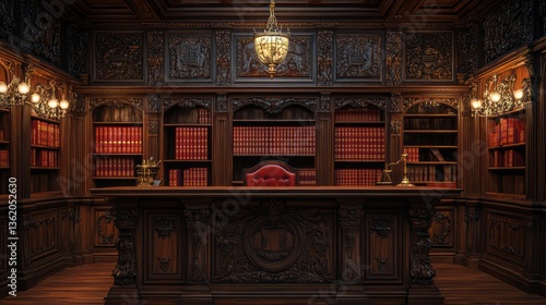 A historic legal office with ornate wooden carvings, rich red leather-bound law books, a grand wooden desk, and dim, ambient