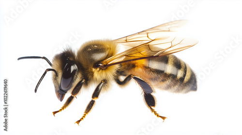 A honey bee is shown in profile on a white background.