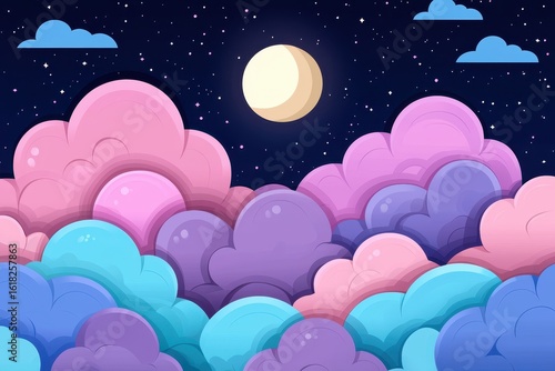 A horizon of soft cotton candy clouds under a glowing moon, with a blank band in the middle for text, ethereal, surreal art.
