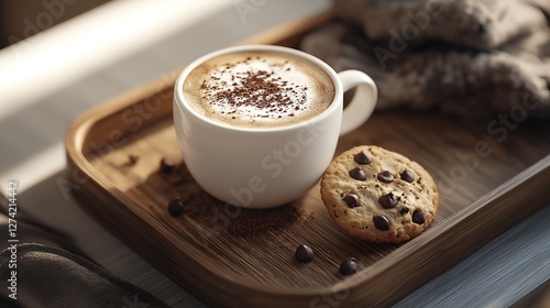 A hot cappuccino served with a chocolate chip cookie on a wooden tray.