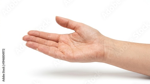 A human hand is open and extended, palm facing upwards, against a clean white background.