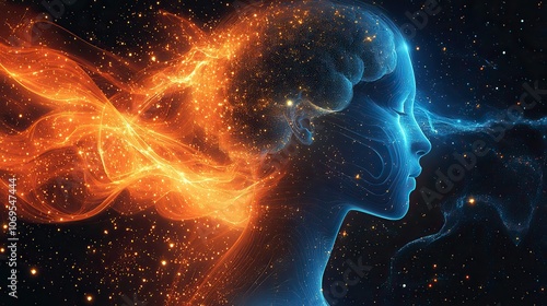 A human head and brain are shown with waveforms illustrating brain activity, all against a digital backdrop.