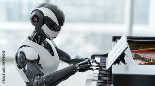 A humanoid robot playing a piano in a modern setting.