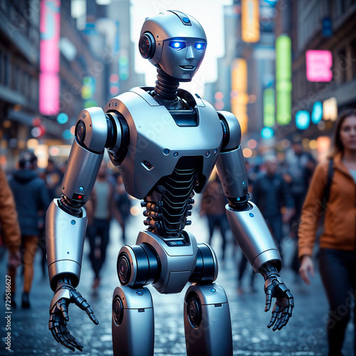 A humanoid robot with glowing blue eyes stands in a crowded city street