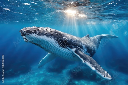 A humpback whale swimming in the ocean, showcasing its majestic size and grace underwater