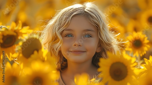 A hyper-realistic photograph of A candid moment of a child playing in a field of sunflowers, with the bright yellow flowers surrounding them and the joyful expression on their face, celebrating
